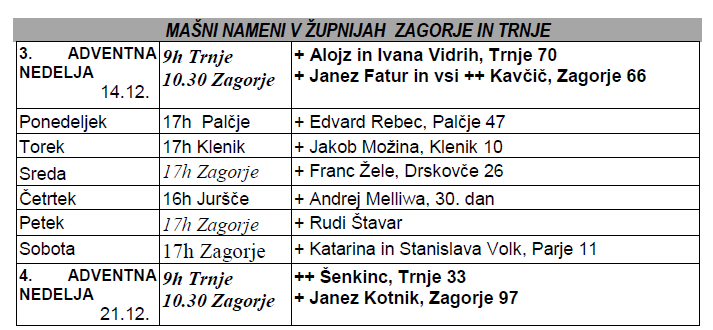 – V Trnju bo adventna spoved danes, 14. decembra, ob 14h.
