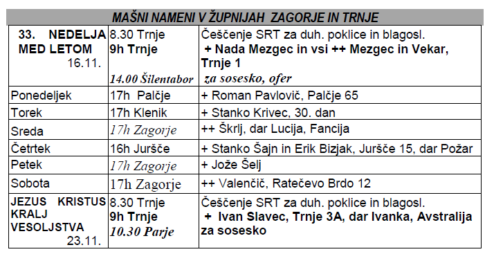 – Svete maše naročate pri župniku Marjanu. Uradne ure v Pivki so ob ponedeljkih in torkih od 10. do 12. ure. V tem času lahko pokličete tudi po telefonu: 041/906-242.